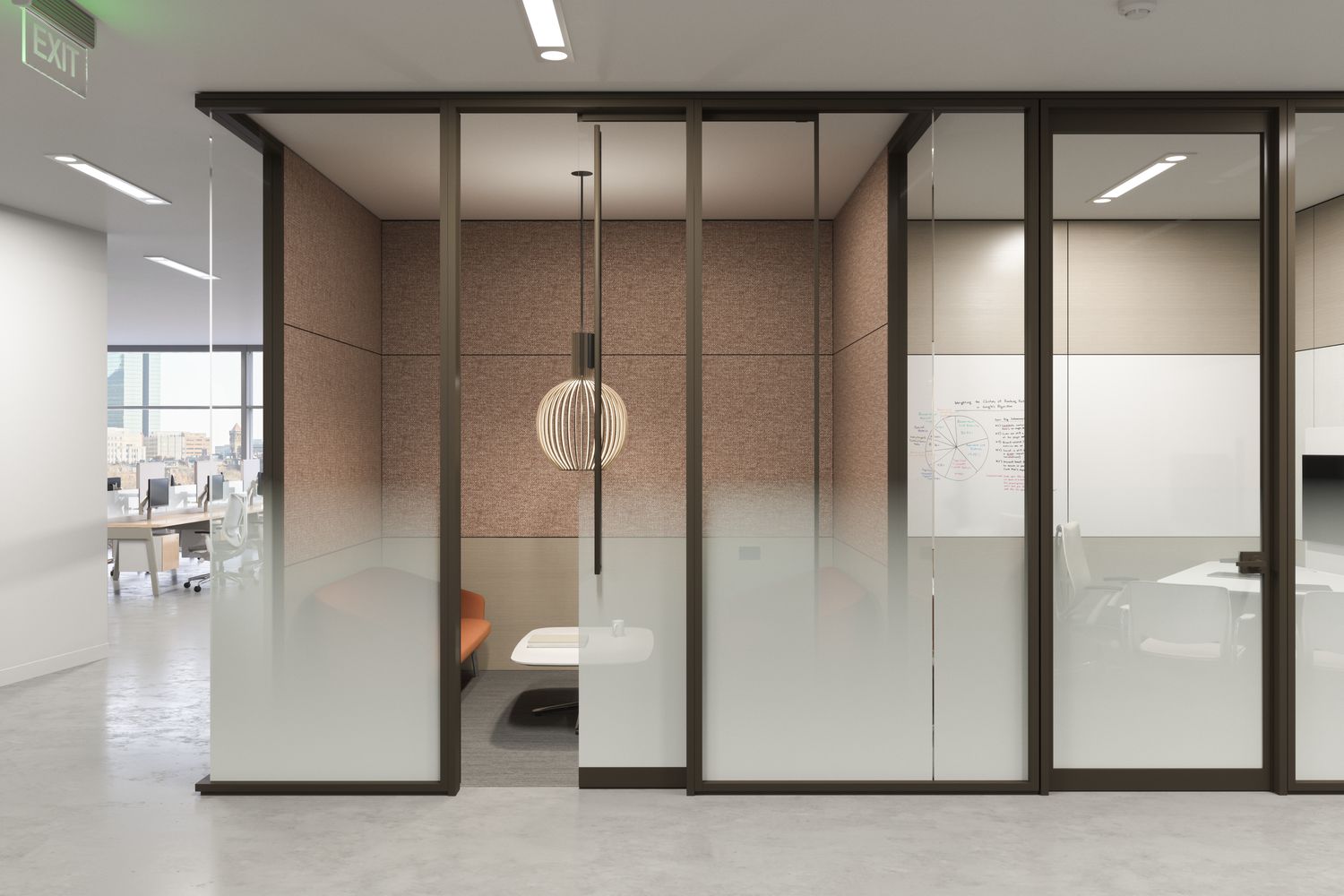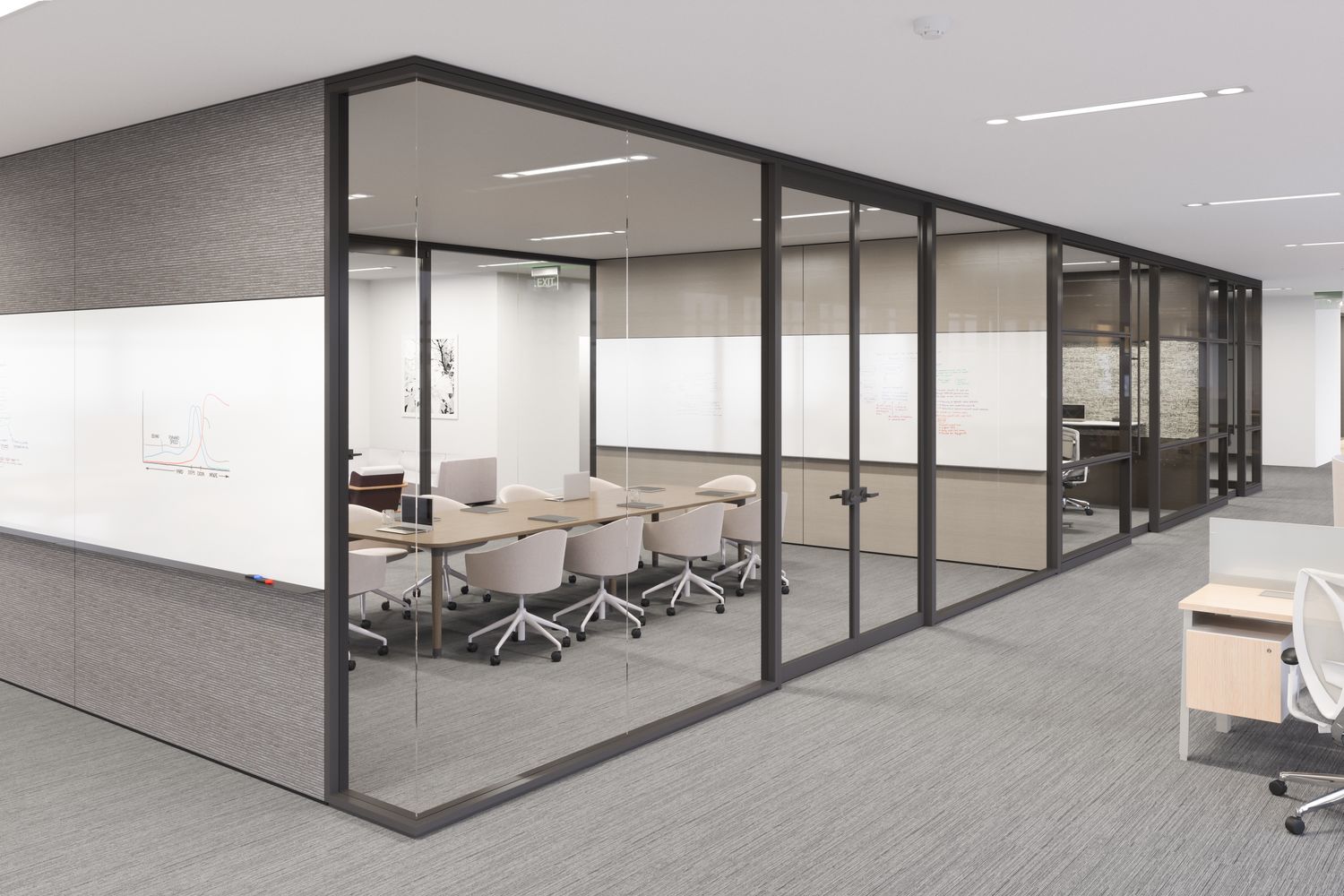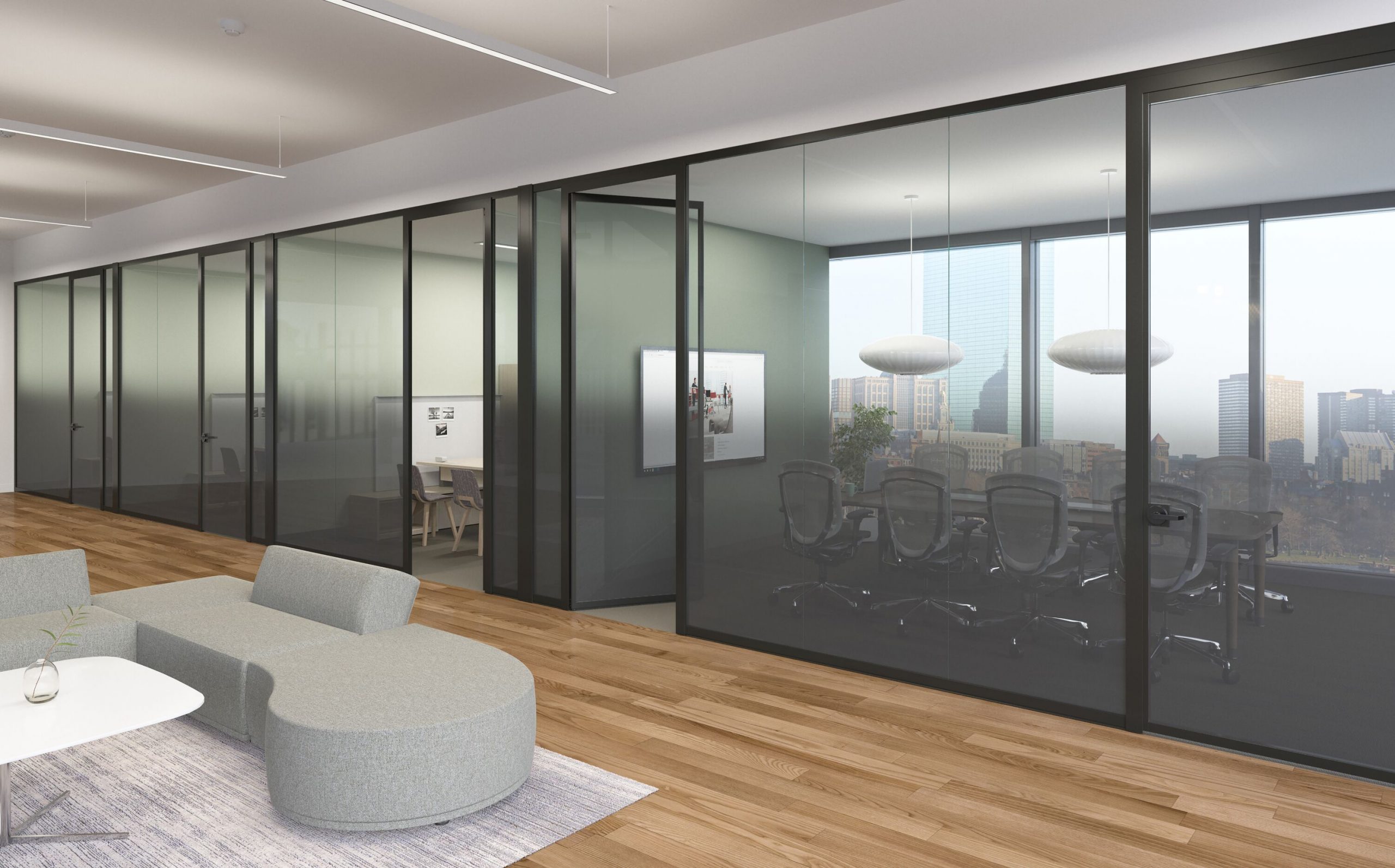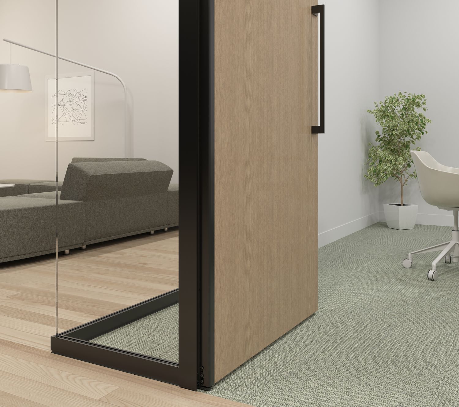 Focus offers a tailored approach to specific environments with its acoustic and visual continuity, and matching wall and door pairings. Frame and trim components are light in proportion through seamless in-line and corner connections, providing a minimal architectural presence.
