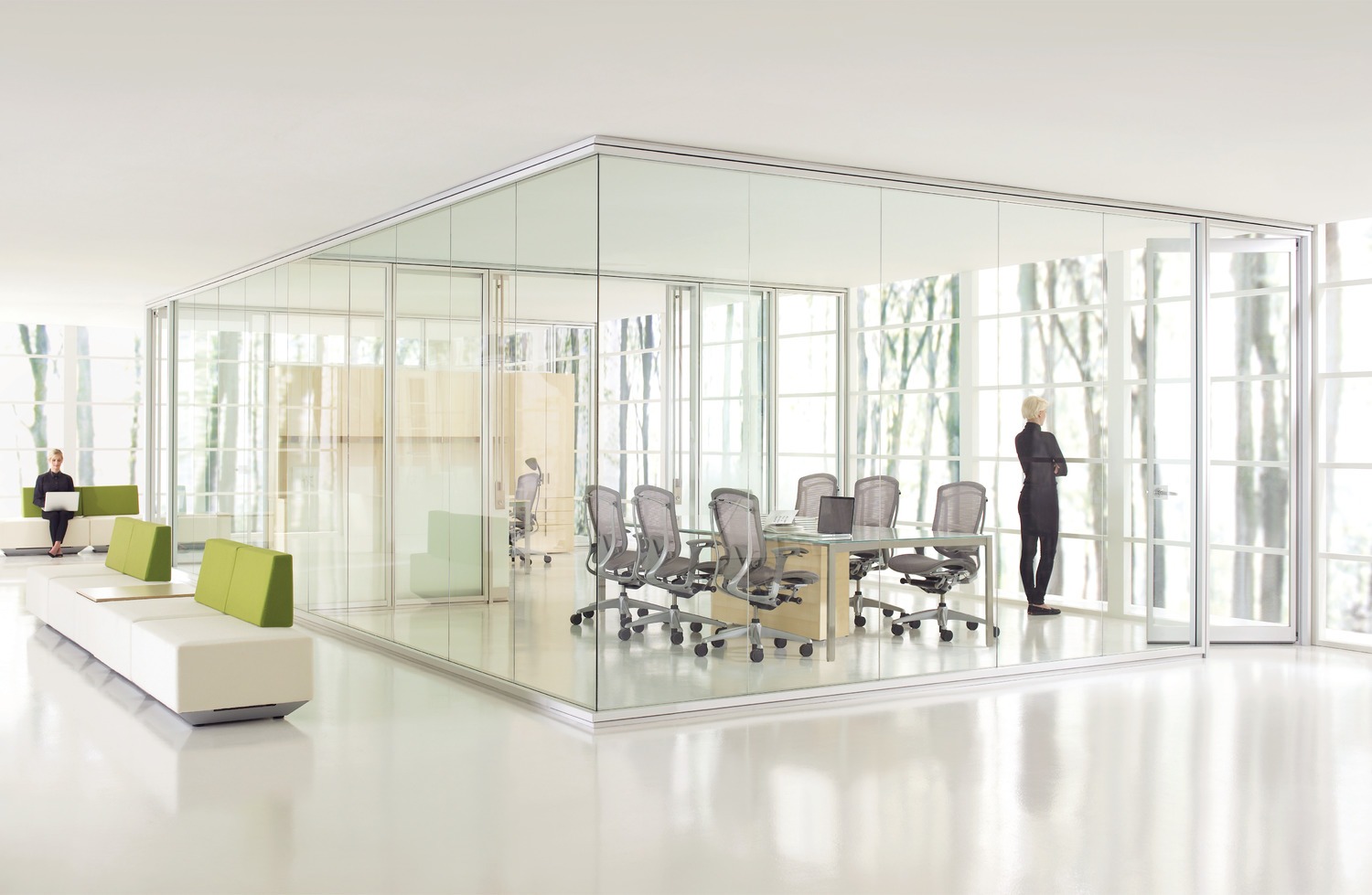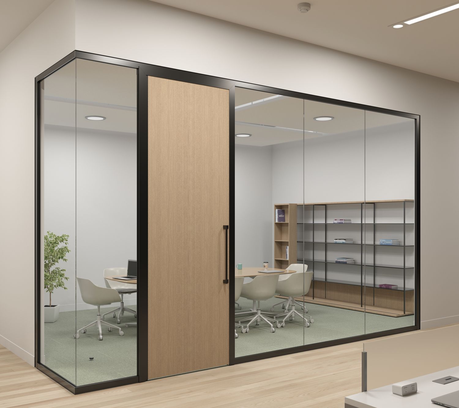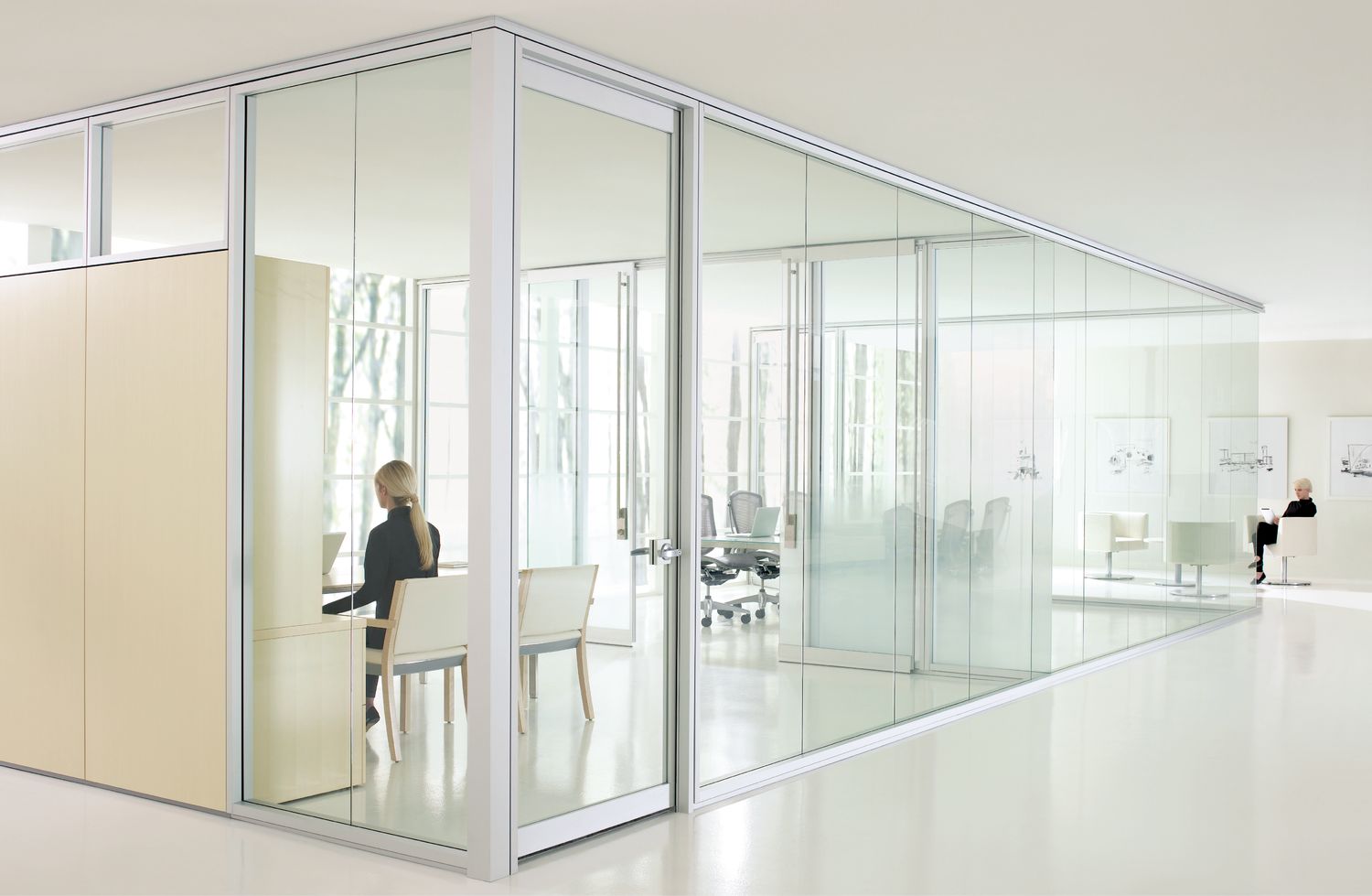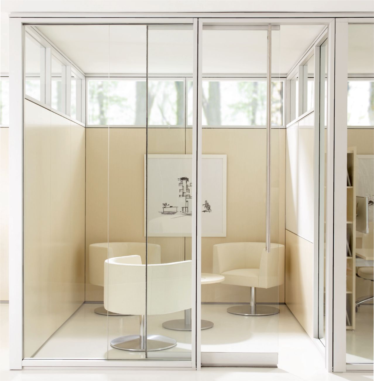 Focus offers a tailored approach to specific environments with its acoustic and visual continuity, and matching wall and door pairings. Frame and trim components are light in proportion through seamless in-line and corner connections, providing a minimal architectural presence.